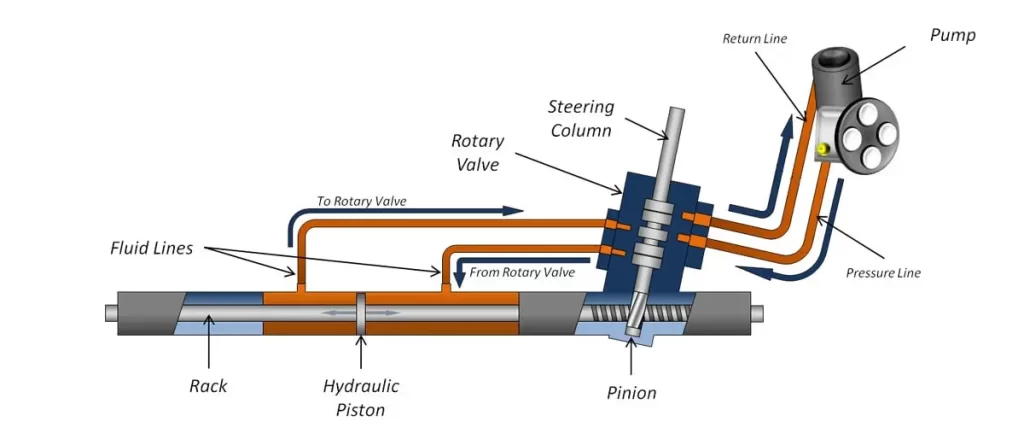 When the driver turns the steering wheel, it causes the steering column to rotate. This movement is translated into linear motion by the steering rack, which pushes or pulls the tie rods connected to the wheels. The control valve regulates the flow of pressurized hydraulic fluid to either side of the steering rack’s piston. This creates a power-assisted force, helping the driver to turn the wheels with reduced effort.