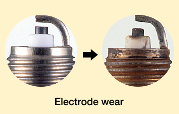 In particular, since the center electrode reaches high temperatures, it oxidizes and wears. The amount of electrode wear varies with the electrode material melting point, strength, hardness, etc. In order to reduce the amount of this wear, nickel alloys, platinum, iridium, and other such materials are used for the electrodes and service lives are also extended with fine electrodes. Also, the wear varies with the engine type and usage conditions, but for normal plugs, it is approximately in the range of 0.10-0.15mm for each 10,000km driven.