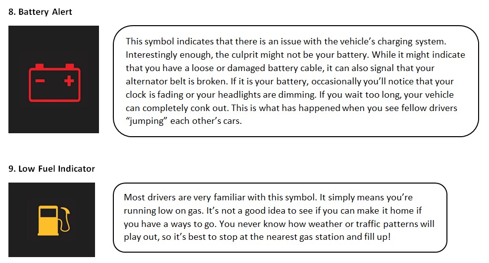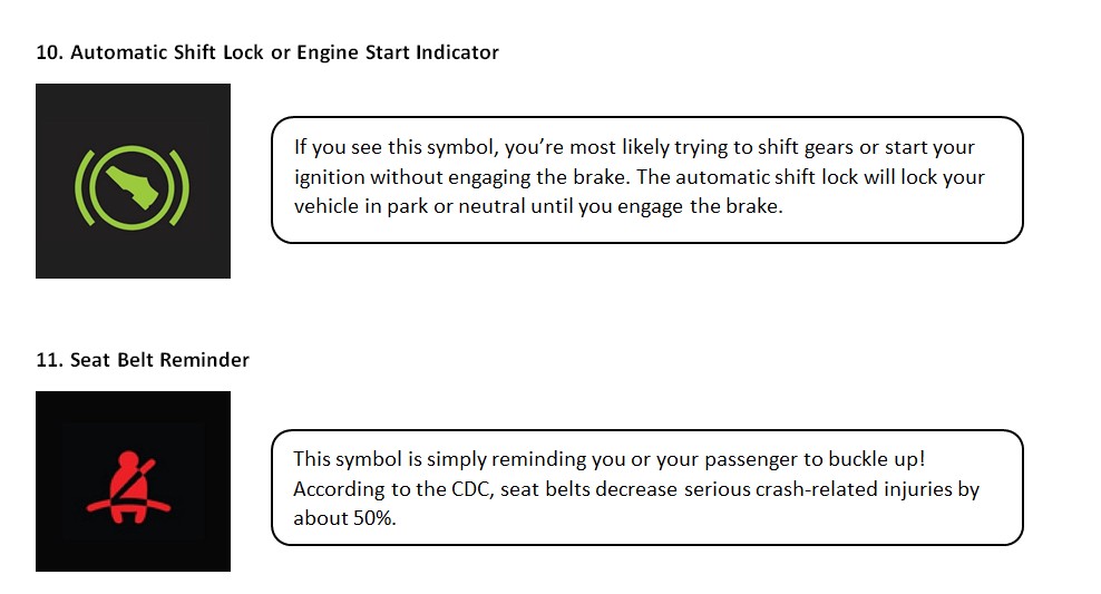 Keep in mind that every car is different, so the symbols on your dashboard may vary slightly from the 15 we’ve mentioned. If in doubt, consult your vehicle’s owner’s manual!