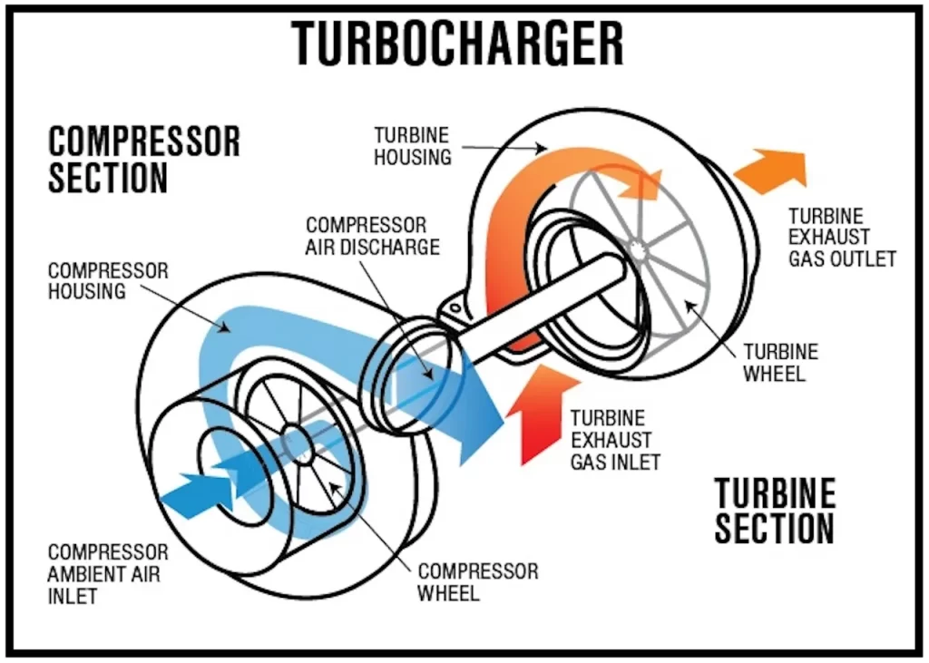A turbocharger consists of a turbine and a compressor that is connected by a shaft. The turbine is driven by exhaust gases, while the compressor forces air into the engine’s intake system. When you press the throttle to accelerate, more exhaust gas is produced, spinning the turbine faster, which should increase the air pressure and power generated by the engine.